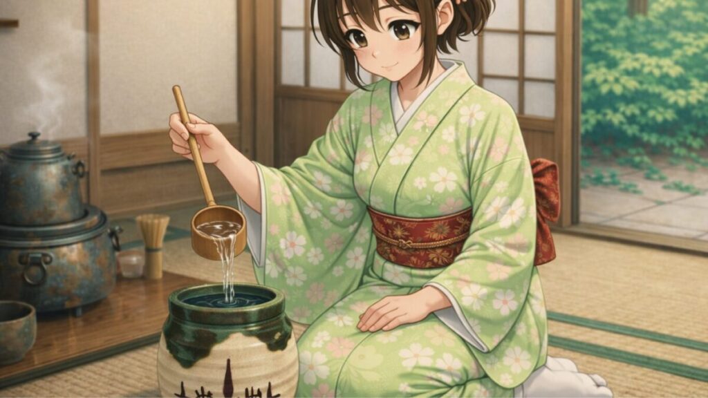- 釜への水の補給(補水):お湯を沸かす「釜」のお湯が減ってきた際に、柄杓(ひしゃく)で水を汲んで足します。茶席のスムーズな進行を支える給水係です。